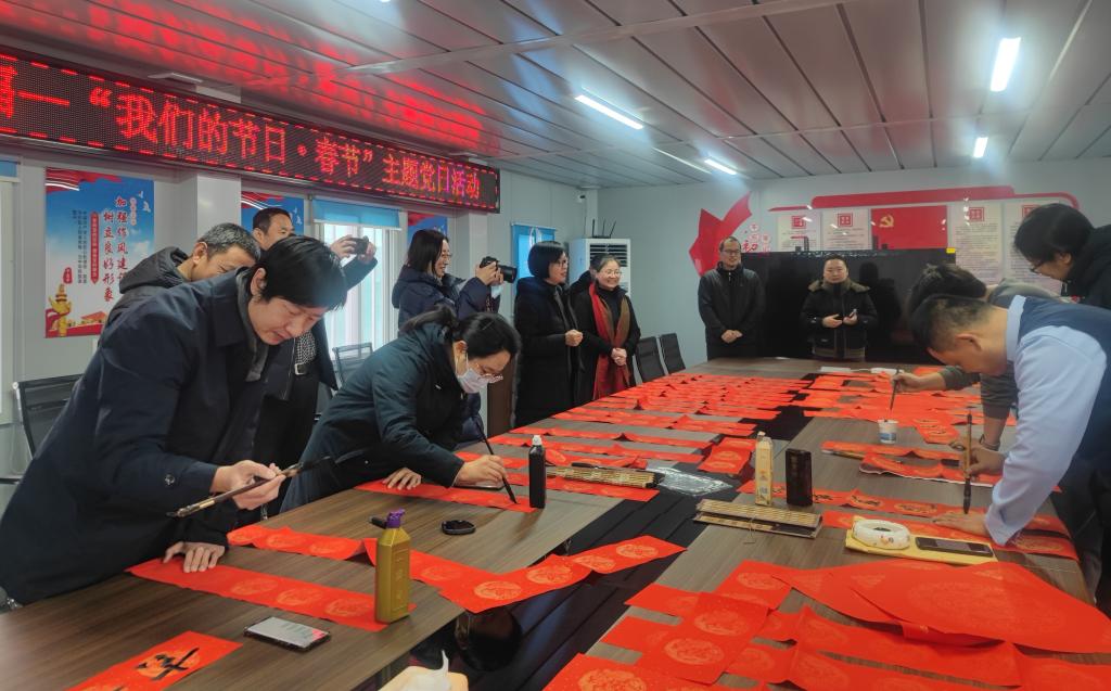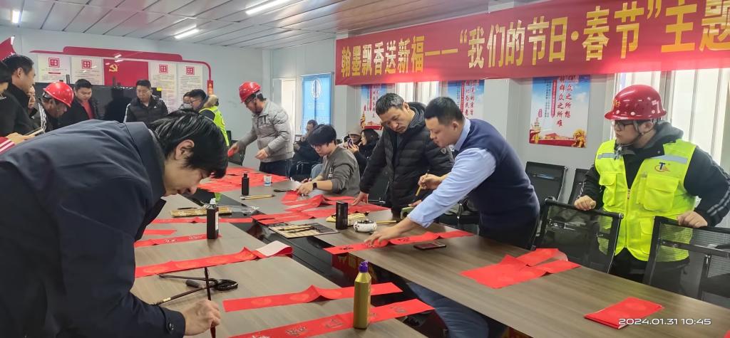活动现场人头攒动,喜气洋洋,老师们饱蘸浓墨、以笔传情。每一幅春联都饱含着吉祥的祈愿,每一个福字都体现着对新年的祝福。建设专班的职工们挑选着心仪的作品,仔细的欣赏着春联创作的瞬间,感叹着传统文化独特的魅力。不少建设专班职工也跃跃欲试,亲手写下新春的祝愿。笑声、笔声声声交映,春联映红了笑脸,福字温暖着人心。