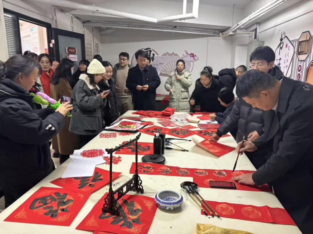 活动现场暖意浓浓,党员教师充分发挥各自专业特长,为社区居民群众写春联、剪窗花,把美好的新春祝福送入千家万户。有的老师泼墨挥毫,苍劲有力的大字行云流水,端庄大气。一横一竖尽显汉字之美,一撇一捺饱含风骨韵味,红纸翻飞间一句句寓意吉祥的新年祝福便跃然纸上,散发着清新墨香的春联融入了大家对辞旧迎新的美好憧憬。社区居民领到了自家“私人定制”的春联,脸上洋溢着微笑,连连点赞“老师们的书法写得真是赏心悦目,这样的春联比外面买到的更有意义。”