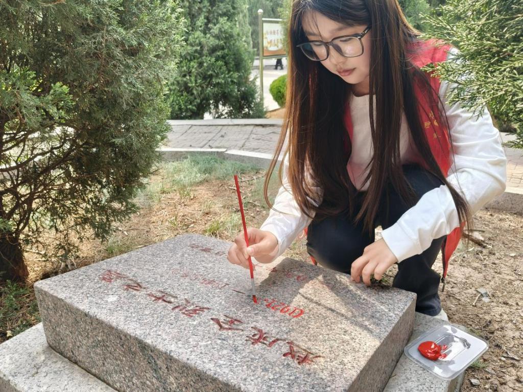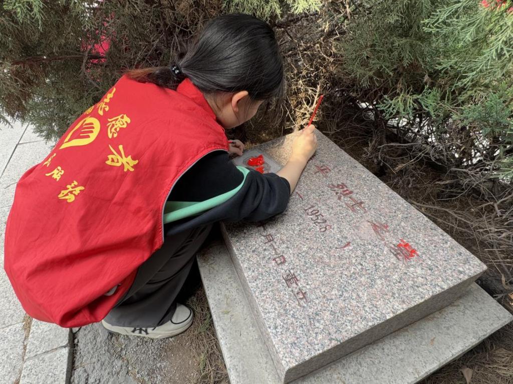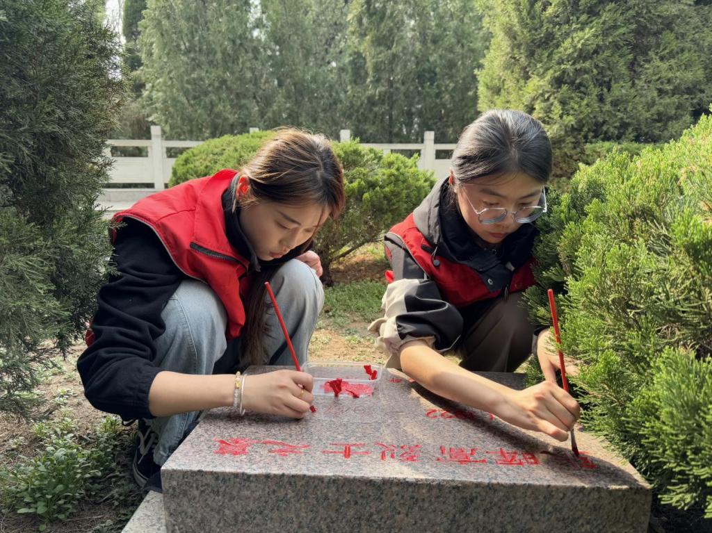 在庄严肃穆的烈士纪念碑前,同学们小心翼翼擦拭墓碑上的浮尘,并沿着碑文的凹痕,一笔一画地涂上红漆。褪色的字迹在他们笔下重焕亮色,仿佛在无声诉说那段波澜壮阔的革命历程。每一道笔触都让大家感受着历史的重量,提醒同学们要铭记先辈的牺牲与担当。