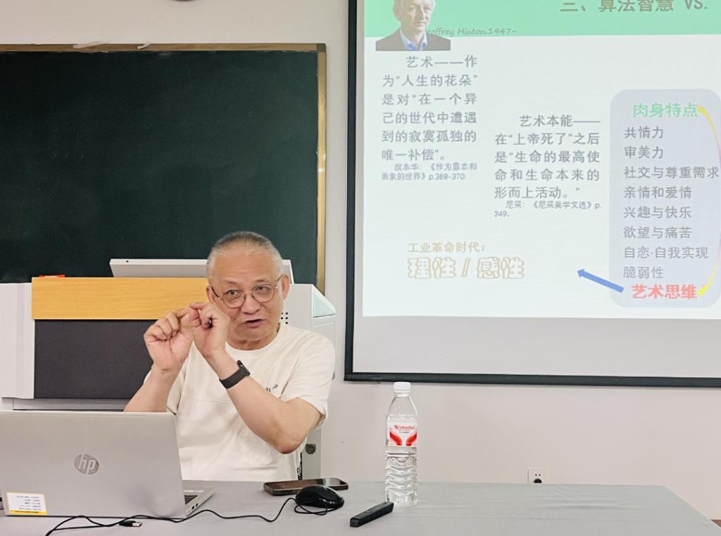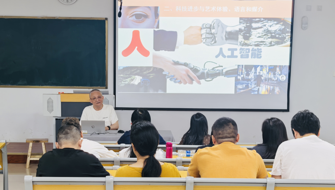 下午的讲座中,孔教授将视角延伸至美育与科技融合的前沿领域。他指出,在人工智能快速发展的当下,高等艺术教育需重新定位人才培养目标,既要夯实学生的审美感知、创意表达等核心素养,又要引导其理解科技与艺术的共生关系。他特别强调,在AI技术可替代部分重复性创作工作的背景下,艺术教育更应聚焦培养学生的批判性思维、文化理解力与情感表达能力,让“人文温度”成为艺术创作者不可替代的竞争力,保持艺术的原创性才有不竭的生命力。
