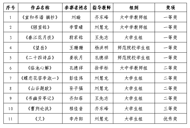 近日,由山东省教育厅、山东省语言文字工作委员会主办的山东省第七届“笔墨中国”中华经典书写大赛获奖名单揭晓。我校选送的师生作品在此次大赛中表现优异,共斩获一等奖5项,二等奖4项,三等奖1项及优秀奖1项,实现“满堂红”。一等奖作品获国赛推荐资格。