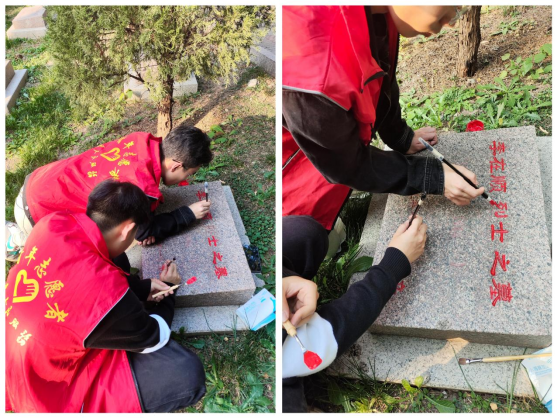 在专业老师的指导下,志愿者们开始为先烈的墓碑进行描红。他们小心翼翼地用纸巾擦去墓碑上的灰尘,然后蹲下身子,认真地对碑文进行描摹填漆。一笔一划间,都饱含着对烈士的崇高敬仰和深切怀念。夕阳西下,完成了22座墓碑的描红工作,金色的光芒照射在焕然一新的墓碑上,映的志愿服务红马甲也更加鲜艳。为烈士墓碑描红,不仅仅是简单的描摹,更是纪念和传承,188改名为taptap点点团总支也将继续带领学生持续进行这项意义非凡的志愿服务活动。
